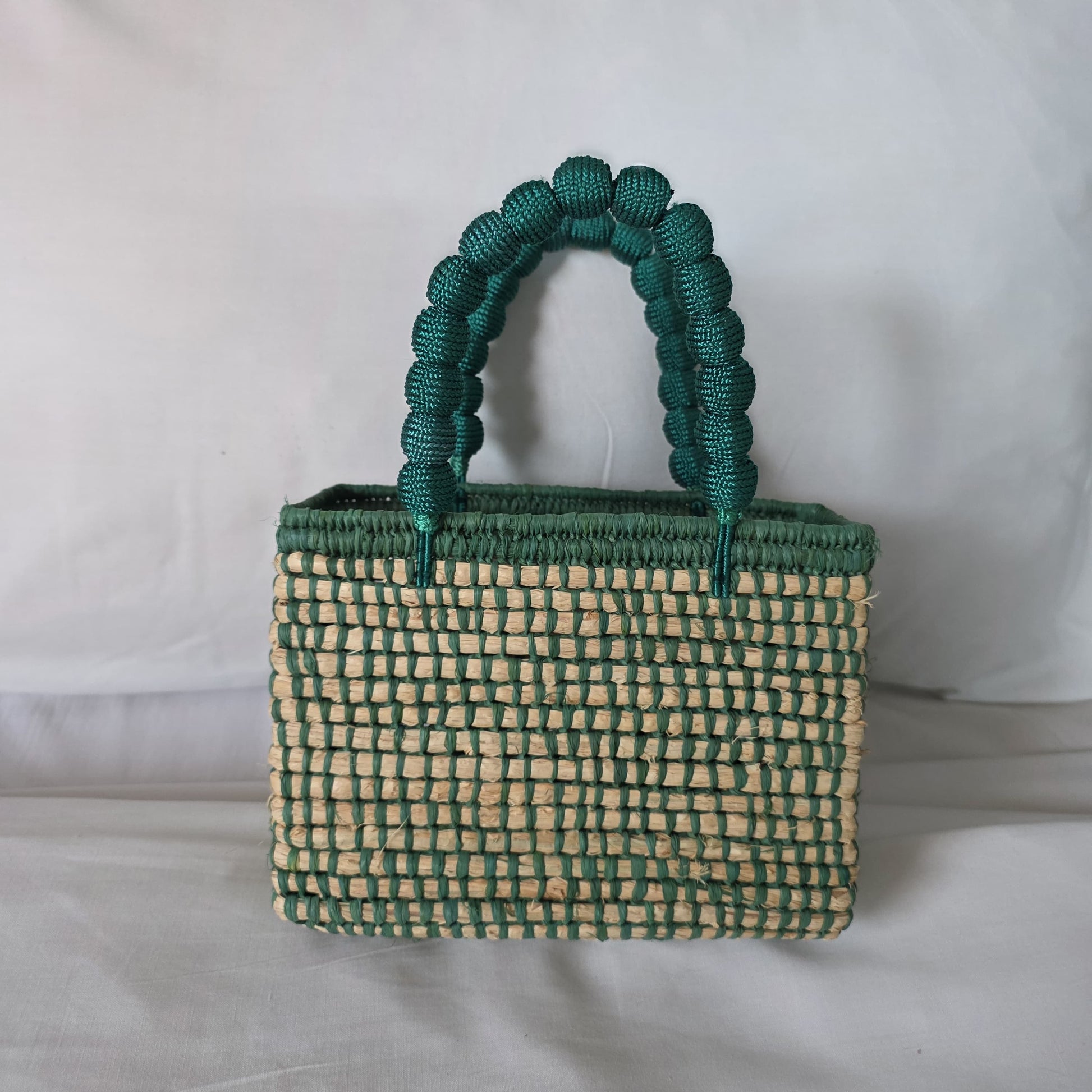 Este bolso está elaborado 100% en rafia natural, tejido a mano con cuidado y detalle por artesanos. Sus asas están formadas por esferas de madera recubiertas con hilo de algodón 100%, también trabajadas de manera artesanal, lo que lo convierte en una pieza única y sostenible.