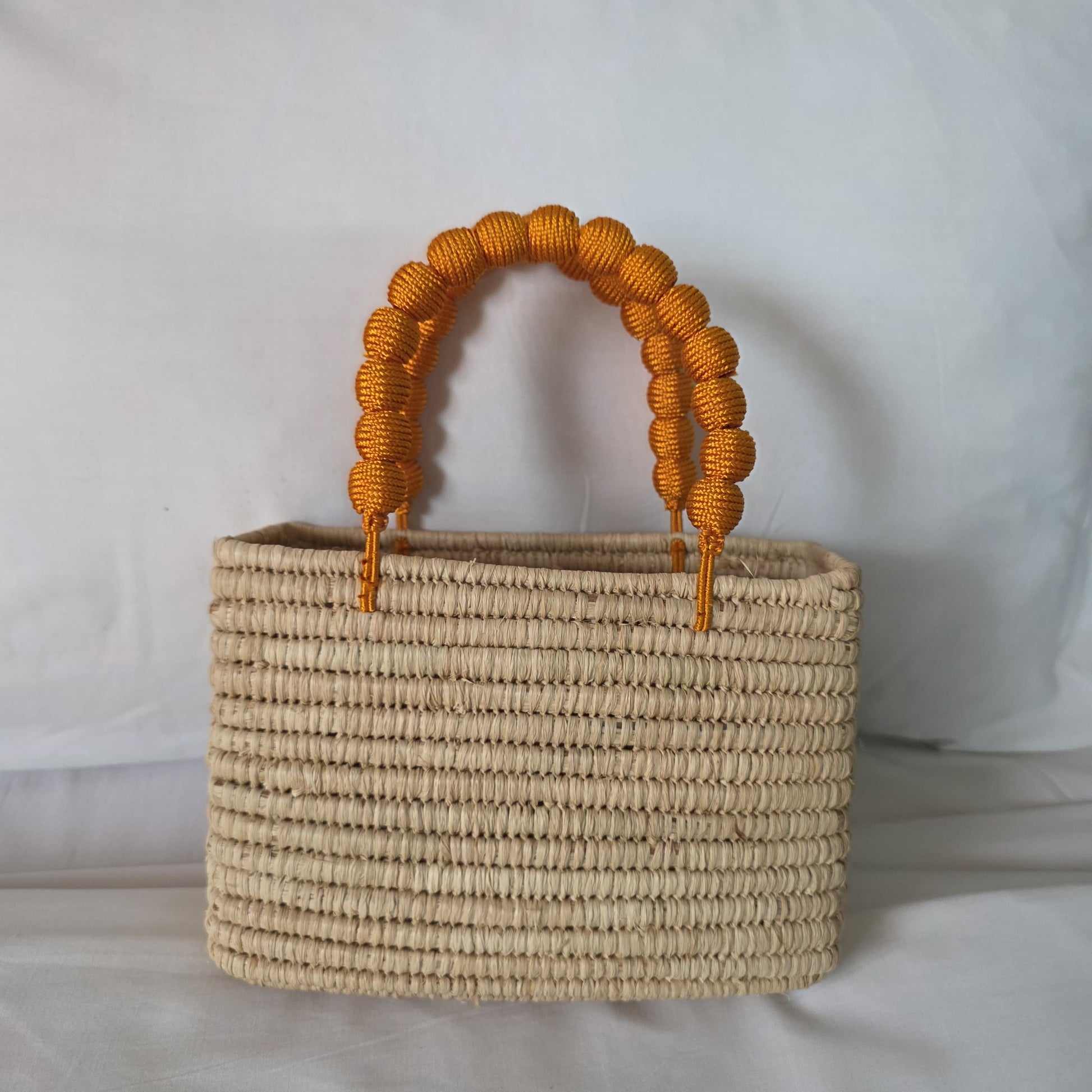 Este bolso está elaborado 100% en rafia natural, tejido a mano con cuidado y detalle por artesanos. Sus asas están formadas por esferas de madera recubiertas con hilo de algodón 100%, también trabajadas de manera artesanal, lo que lo convierte en una pieza única y sostenible.